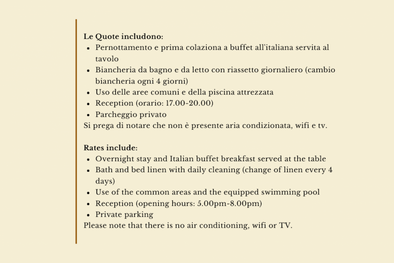 - prima fornitura di biancheria da bagno e da letto con riassetto giornaliero, utilizzo piscina e aree comuni, colazione all’italiana (con prodotti confezionati) e parcheggio.