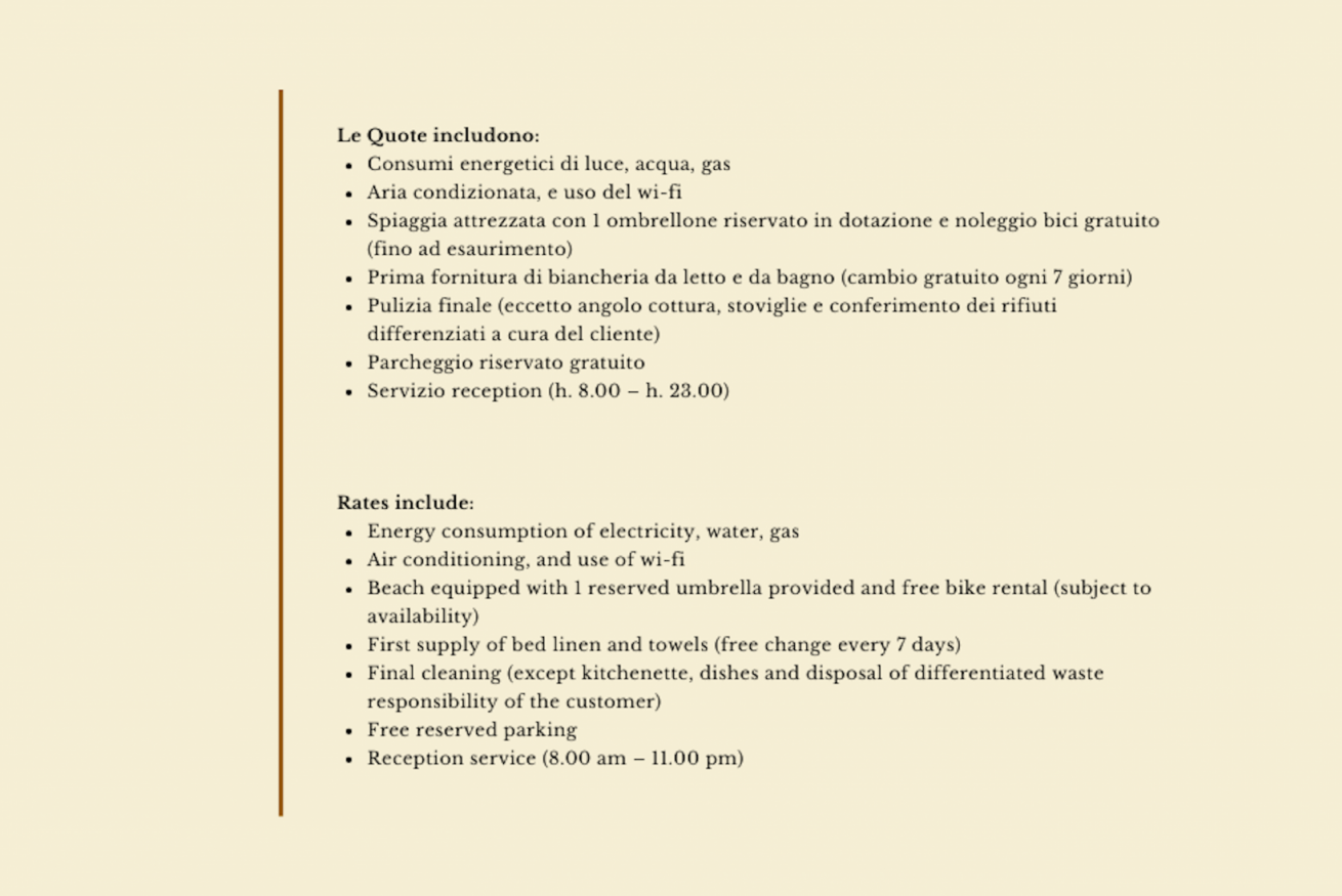 - consumi di luce, acqua, gas, aria condizionata, prima fornitura di biancheria da letto e da bagno (cambio gratuito ogni 7 giorni) uso del wi-fi, noleggio bici gratuito (fino ad esaurimento), 1 ombrellone con sdraio fino a esaurimento, uso della spiaggia privata, posto auto e pulizia finale (esclusa pulizia angolo cottura, a cura del cliente)