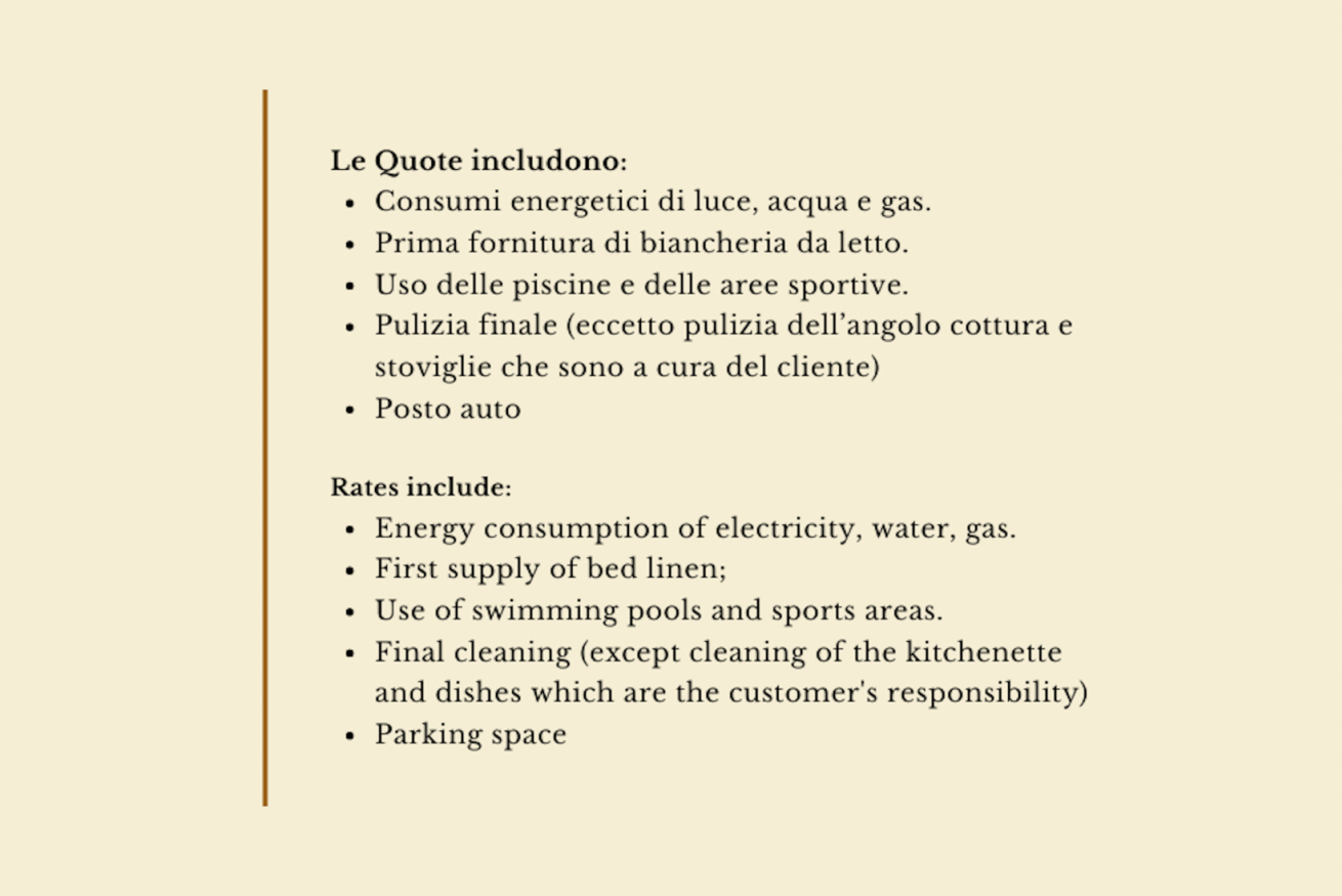 - Si ricorda che la pulizia dell'angolo cottura, stoviglie e corredi della cucina è una responsabilità a carico del cliente, in caso contrario verranno addebitati € 35.