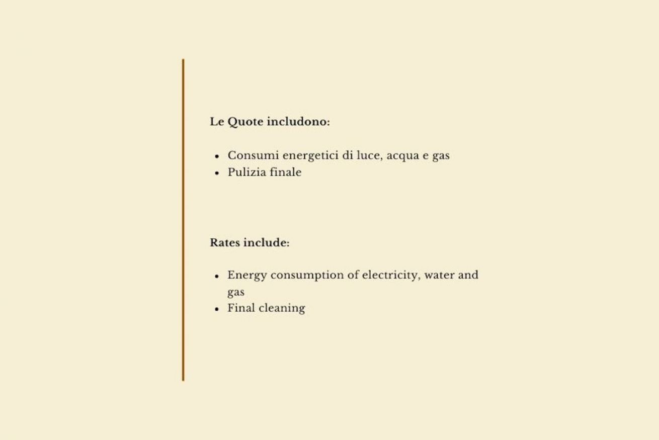 - Cauzione: € 150 ad appartamento restituibili alla fine del soggiorno previo un controllo delle condizioni dell'appartamento.