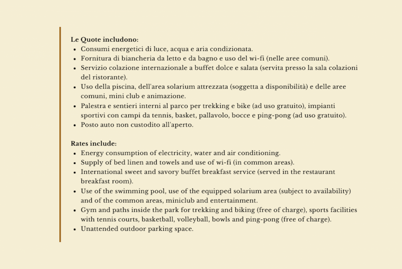 - consumi di luce e acqua, biancheria da letto e da bagno , aria condizionata e riscaldamento, servizio colazione internazionale a buffet dolce e salata (servita presso la sala colazioni del ristorante); uso del wi-fi (nelle aree comuni), uso della piscina, dell’area solarium (soggetta a disponibilità) e delle aree comuni. Campi sportivi con apertura dal 22/05 al 13/09, miniclub ed animazione, area deposito biciclette (su prenotazione) e 1 posto auto.