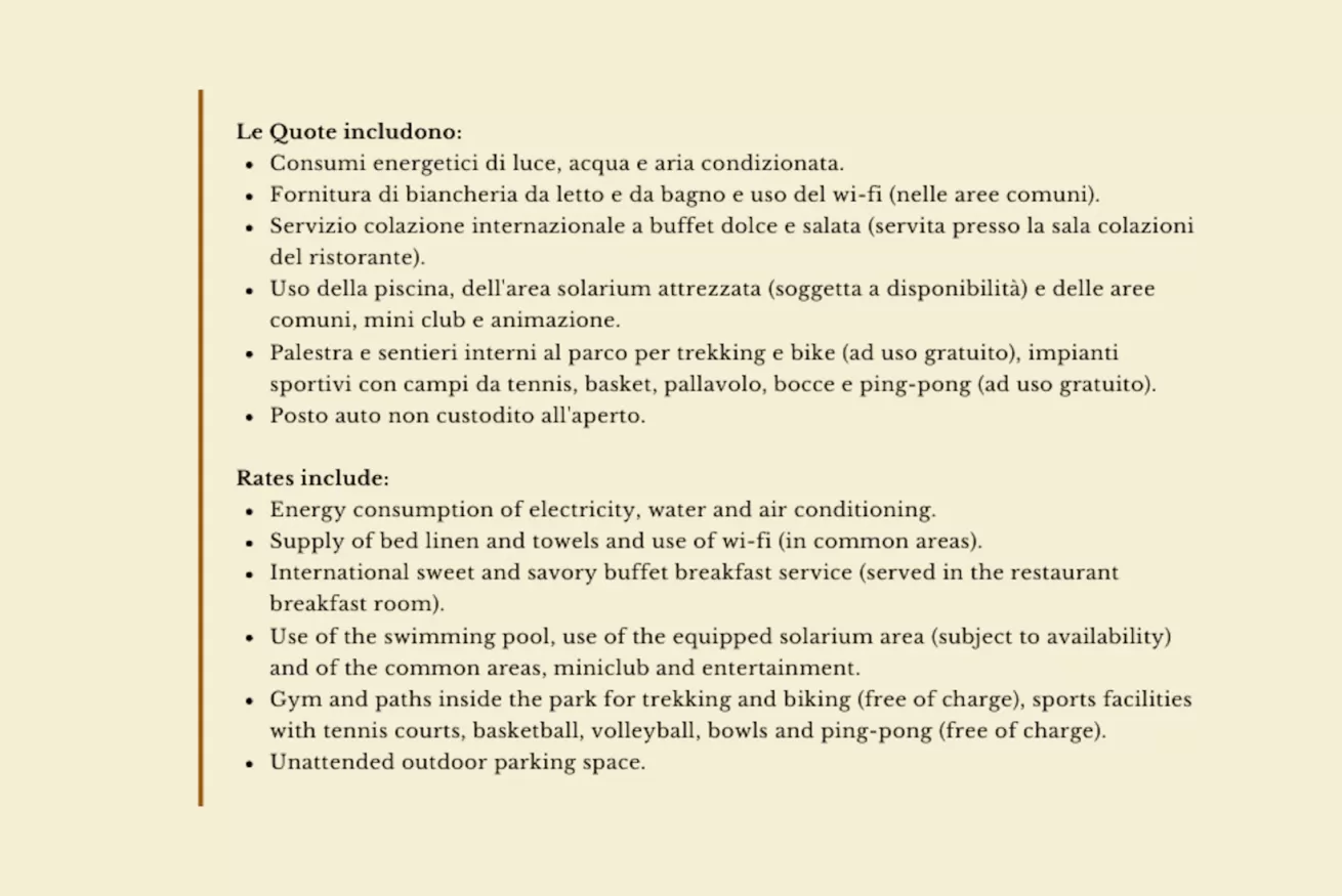- consumi di luce e acqua, biancheria da letto e da bagno , aria condizionata e riscaldamento, servizio colazione internazionale a buffet dolce e salata (servita presso la sala colazioni del ristorante); uso del wi-fi (nelle aree comuni), uso della piscina, dell’area solarium (soggetta a disponibilità) e delle aree comuni. Campi sportivi con apertura dal 22/05 al 13/09, miniclub ed animazione, area deposito biciclette (su prenotazione) e 1 posto auto.