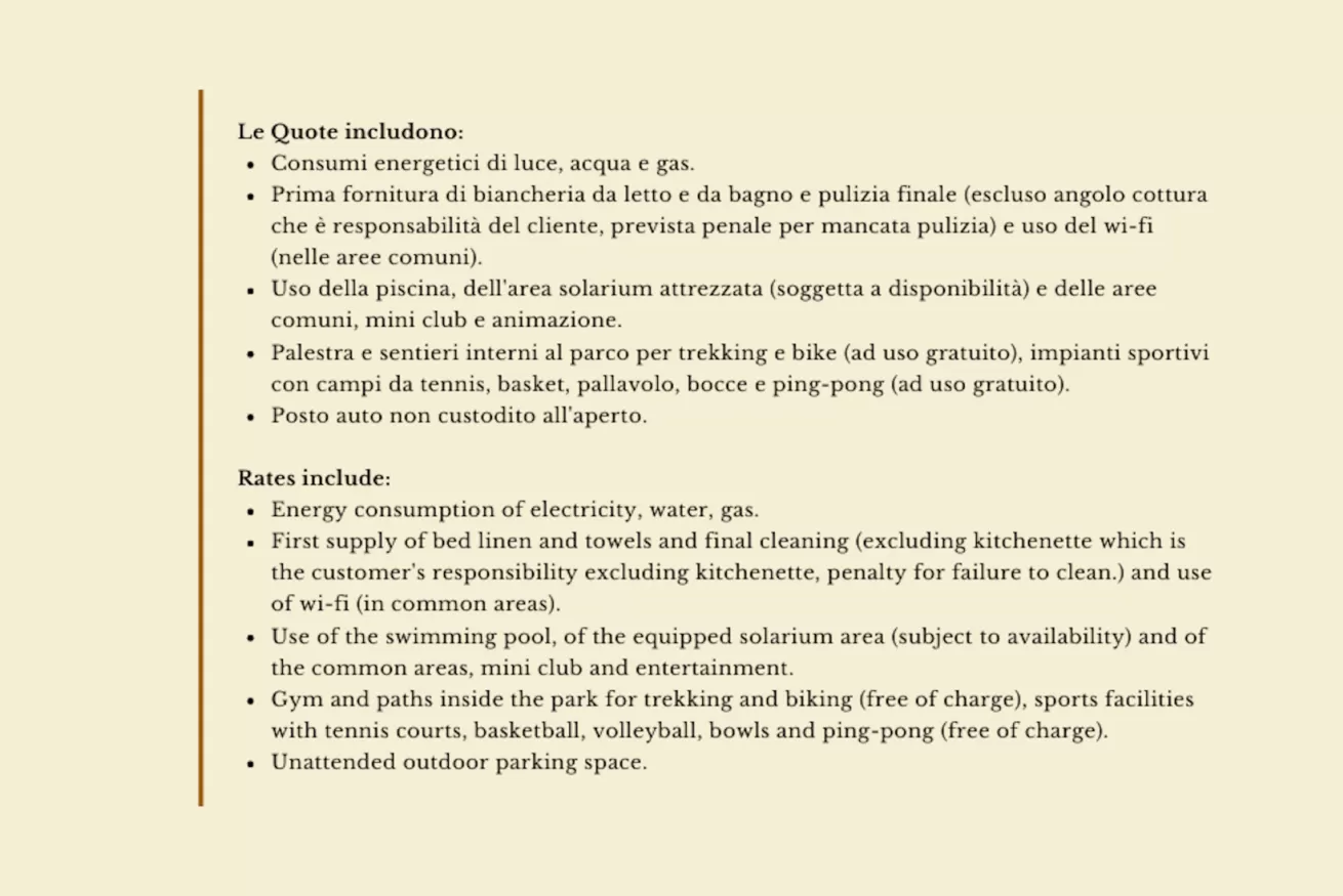 - consumi acqua luce e gas, prima fornitura di biancheria da letto e da bagno, pulizia finale escluso angolo cottura (supplemento di € 30 per mancata pulizia); uso del wi-fi (nelle aree comuni), uso della piscina, dell’area solarium (soggetta a disponibilità) e delle aree comuni. Campi sportivi con apertura dal 22/05 al 13/09, miniclub ed animazione, area deposito biciclette (su prenotazione) e 1 posto auto.
