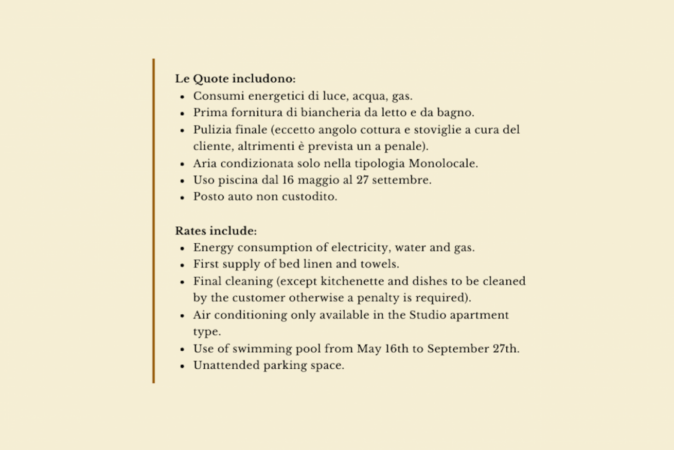 Consumi energetici, prima fornitura di biancheria da letto e da bagno con cambio settimanale, uso piscina aperta dal 16 maggio al 27 settembre. Posto auto e pulizia finale eccetto angolo cottura e stoviglie che sono a cura del cliente, in caso contrario verranno addebitati ulteriori € 30.
