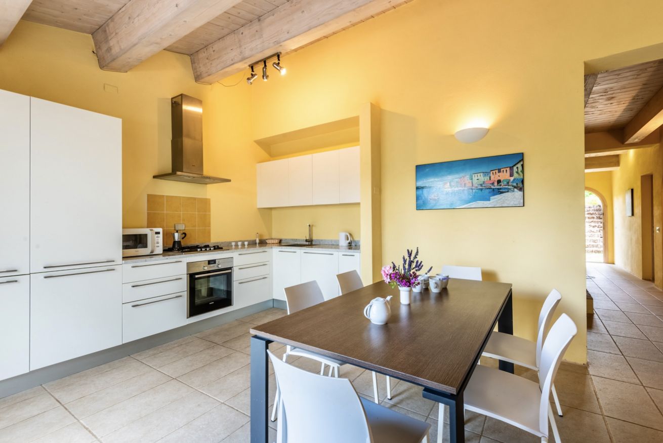 Comodi divani, caminetto, ampio banco da colazione, due camere matrimoniali con bagno privato con vasca e doccia al piano terra, una camera matrimoniale al primo piano con bagno con doccia.