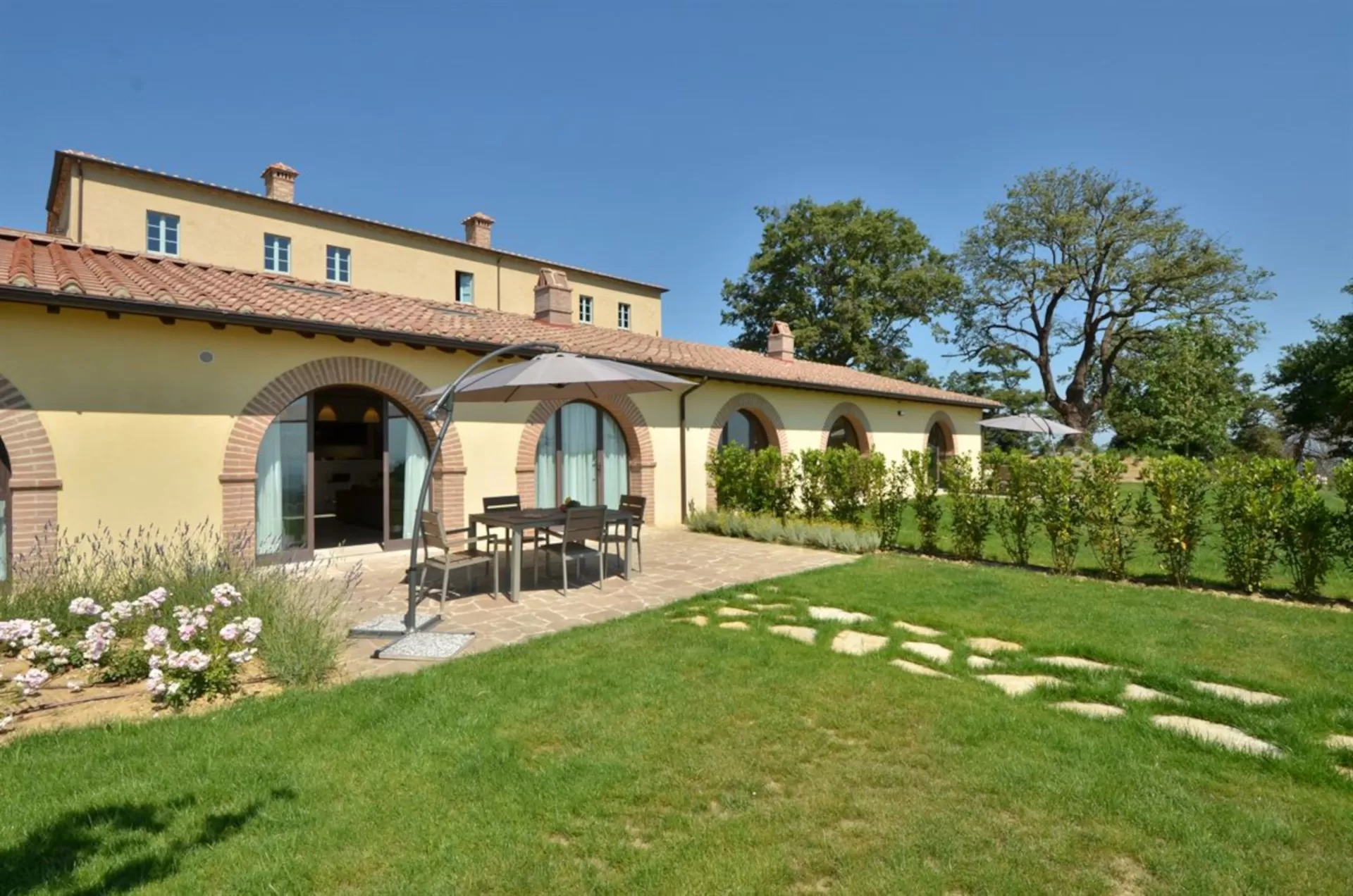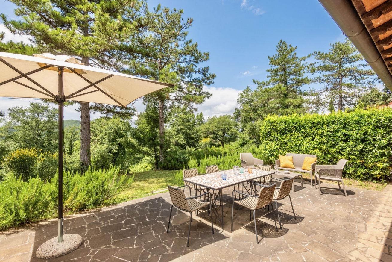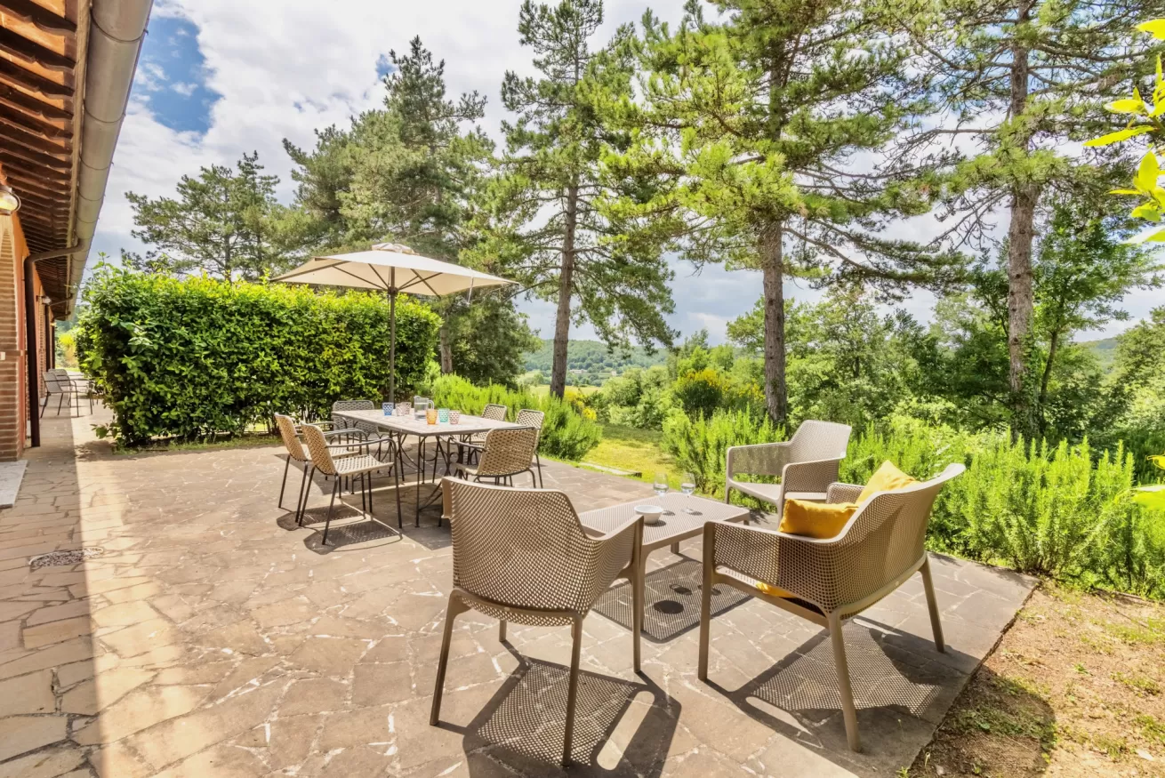 Il giardino e due terrazze arredate offrono il massimo confort unito alla splendida vista del lago e delle valli di Cortona e Montepulciano.