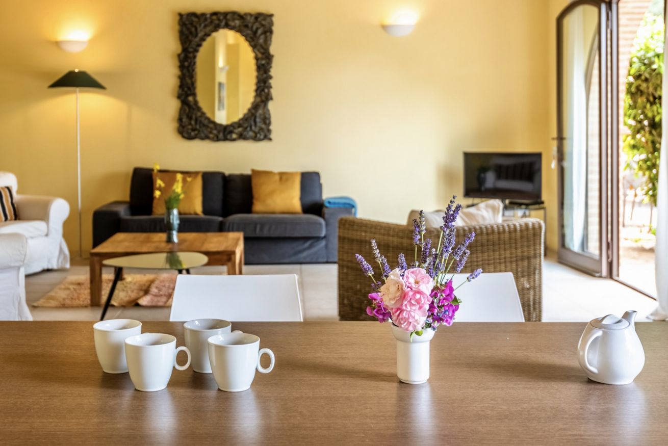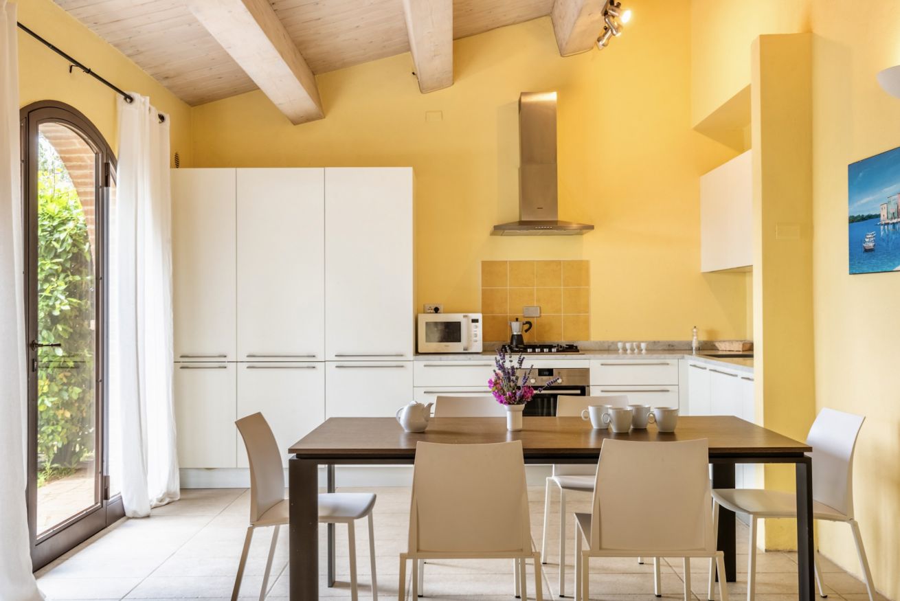 Elegante e spaziosa Villa al piano terreno di 142 mq situata in una zona privata della tenuta adatta per chi ha difficolta' di mobilita'. Composta da ampio soggiorno con camino, cucina completa di lavastoviglie, forno a microonde, forno elettrico, moka, bollitore, frigorifero e freezer.