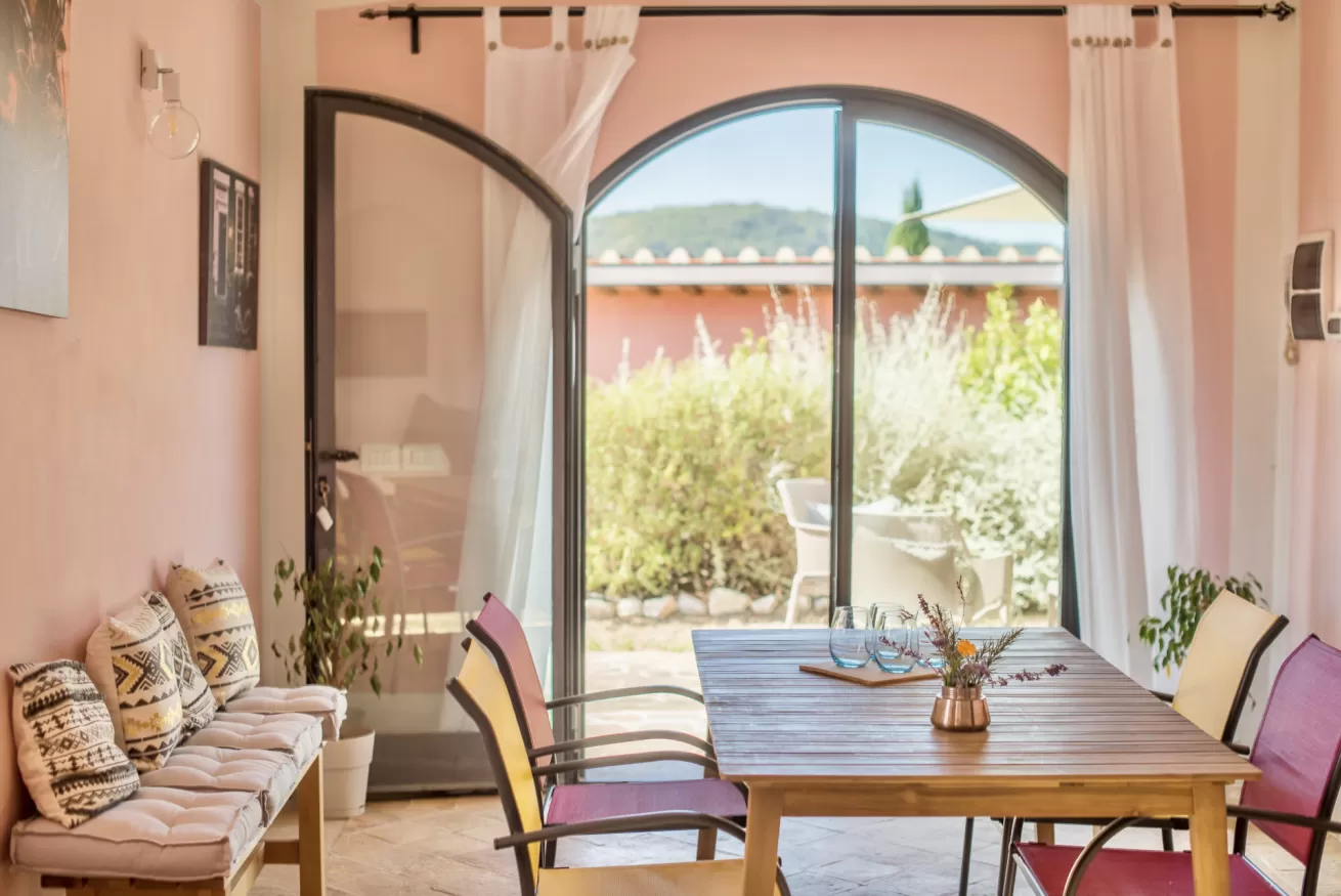 Zona pranzo interna ed esterna, una camera matrimoniale con bagno privato con vasca e un'altra camera matrimoniale con bagno con doccia adiacente.