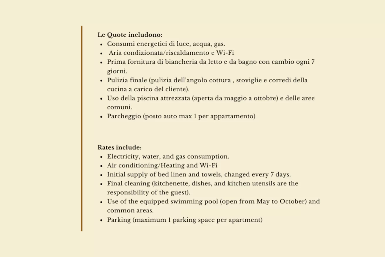 - consumi energetici di luce, acqua, gas, prima fornitura di biancheria da bagno e da letto con cambio settimanale, utilizzo piscina e aree comuni, wi-fi, posto auto (max 1 per appartamento) e pulizia finale.