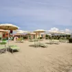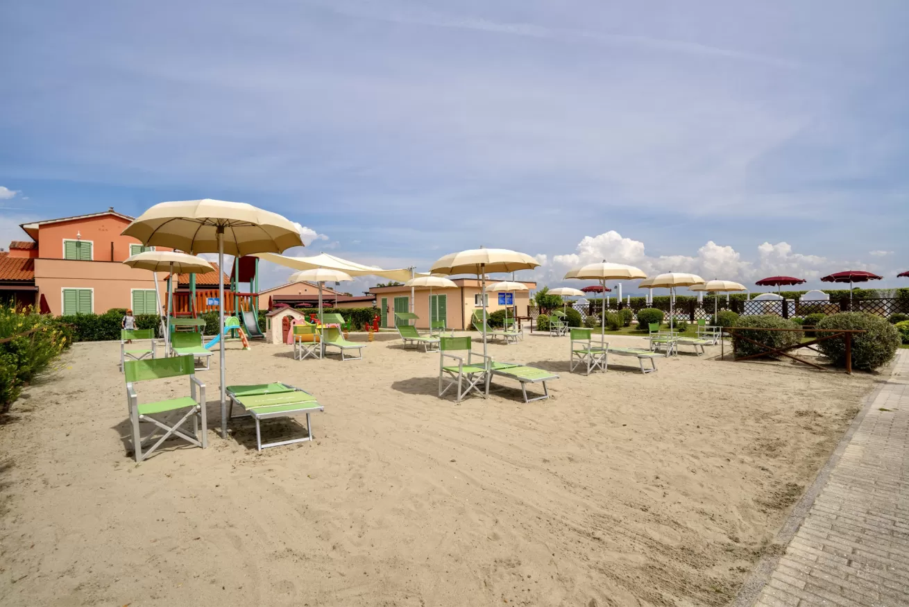 - replica di una spiaggia sabbiosa attrezzata con sdraio e ombrelloni a bordo piscina