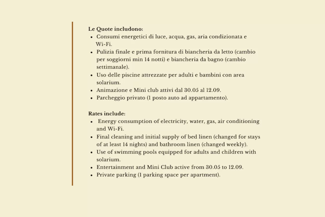 - biancheria letto con cambio settimanale (per un soggiorno minimo di 14 giorni)